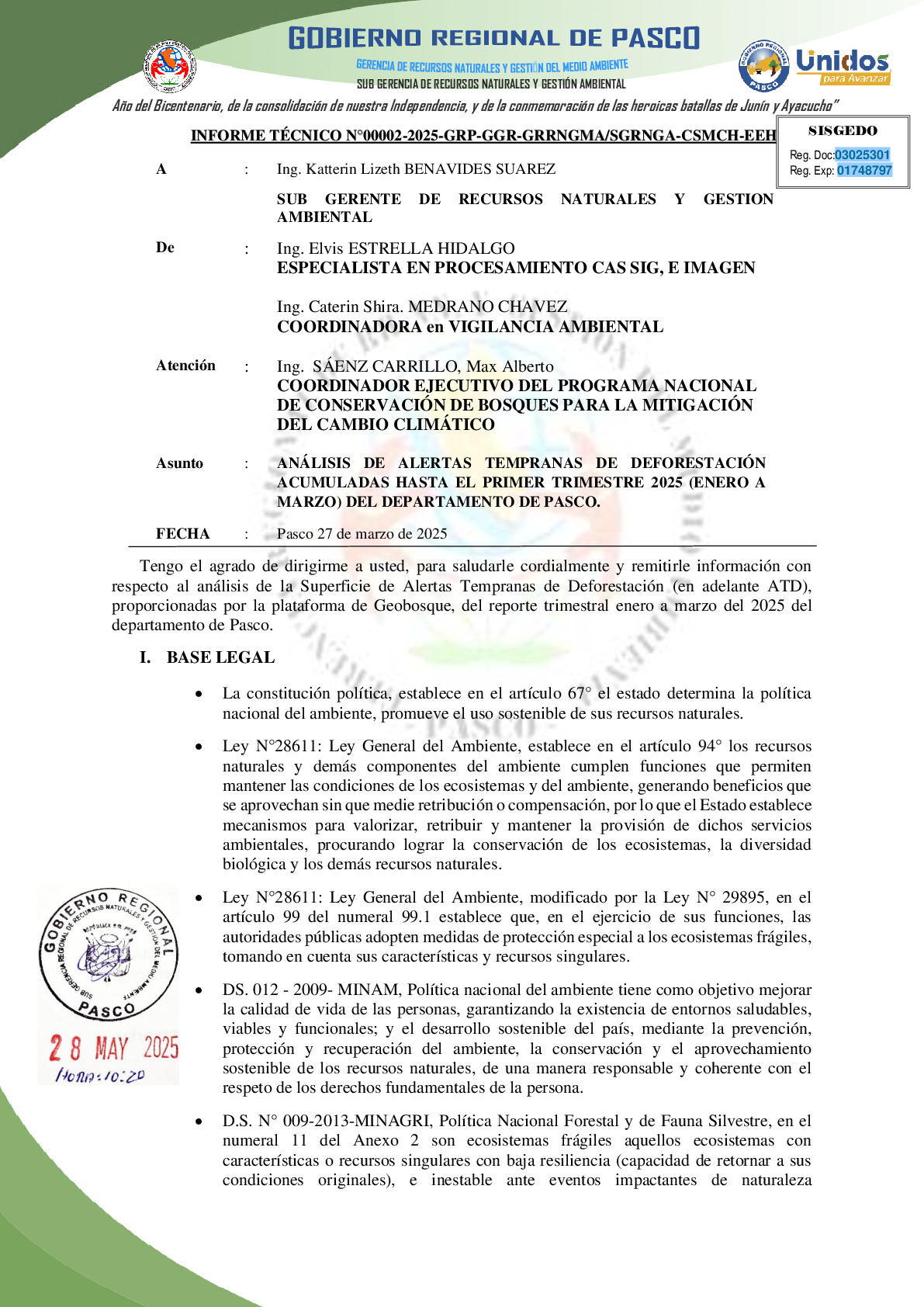 Convenio específico de cooperación interinstitucional entre el Programa Nacional de Conservación de Bosques para la Mitigación del Cambio Climático y el Gobierno Regional de Pasco, con la finalidad de ejecutar el monitoreo de perdida de bosque de la región y con el objetivo de conservar los bosques tropicales en el ámbito territorial.