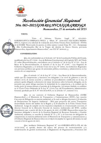 Aprobación de la FITSA: renovación del puente en el camino vecinal EMP. HV-125 – Sunipampa – río Ccollccehuayllo (río de la Virgen), distrito de Nuevo Occoro, provincia de Huancavelica, departamento de Huancavelica.