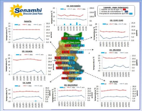 - Monitoreo de temperaturas máximas, mínimas (°C) y precipitaciones (mm) diarias en la Región Puno del mes de mayo – 2025 (estaciones).