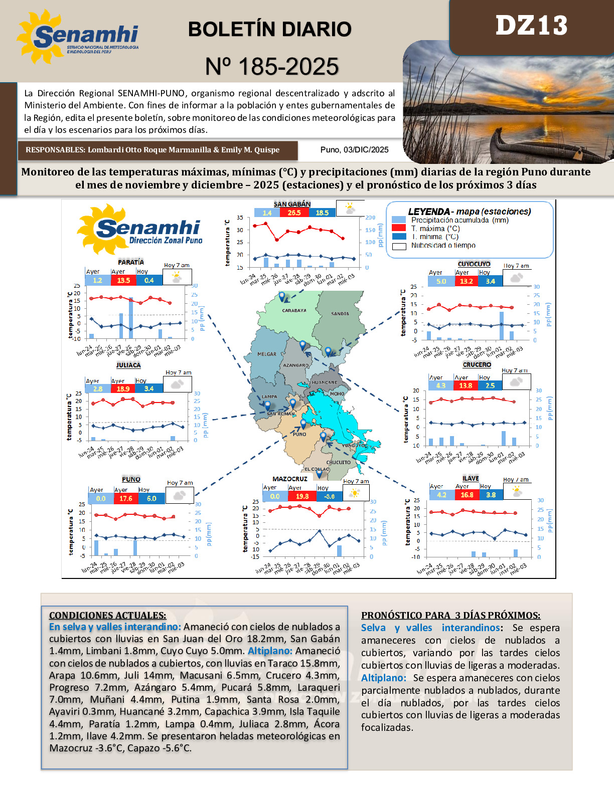 La Dirección Regional SENAMHI-PUNO, organismo regional descentralizado y adscrito al Ministerio del Ambiente. Con fines de informar a la población y entes gubernamentales de la Región, edita el presente boletín, sobre monitoreo de las condiciones meteorológicas para el día y los escenarios para los próximos días.