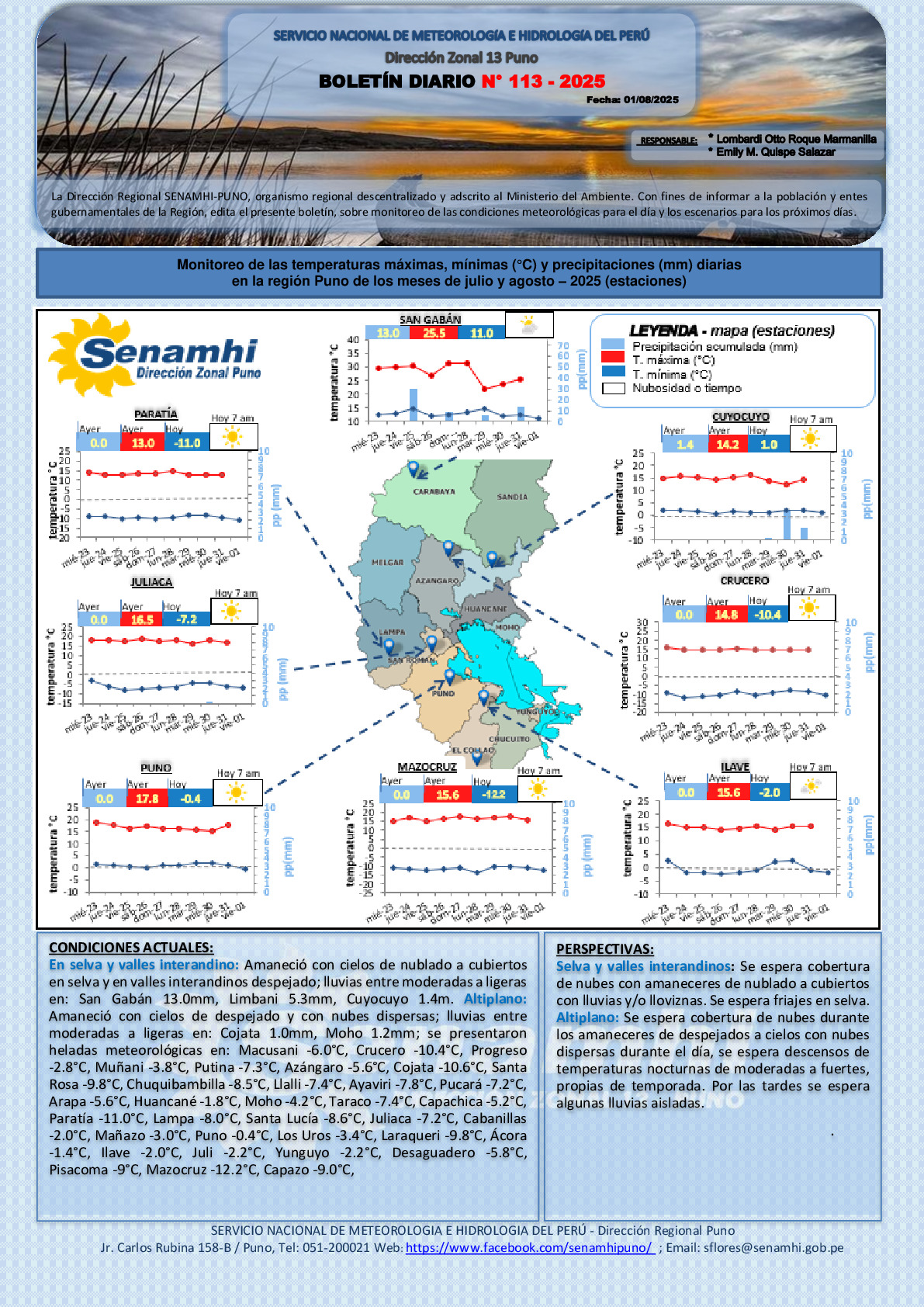 BOLETIN HIDROMETEOROLOGICO DIARIO DE LA REGION DE PUNO PARA EL 01 DE AGOSTO DE 2025