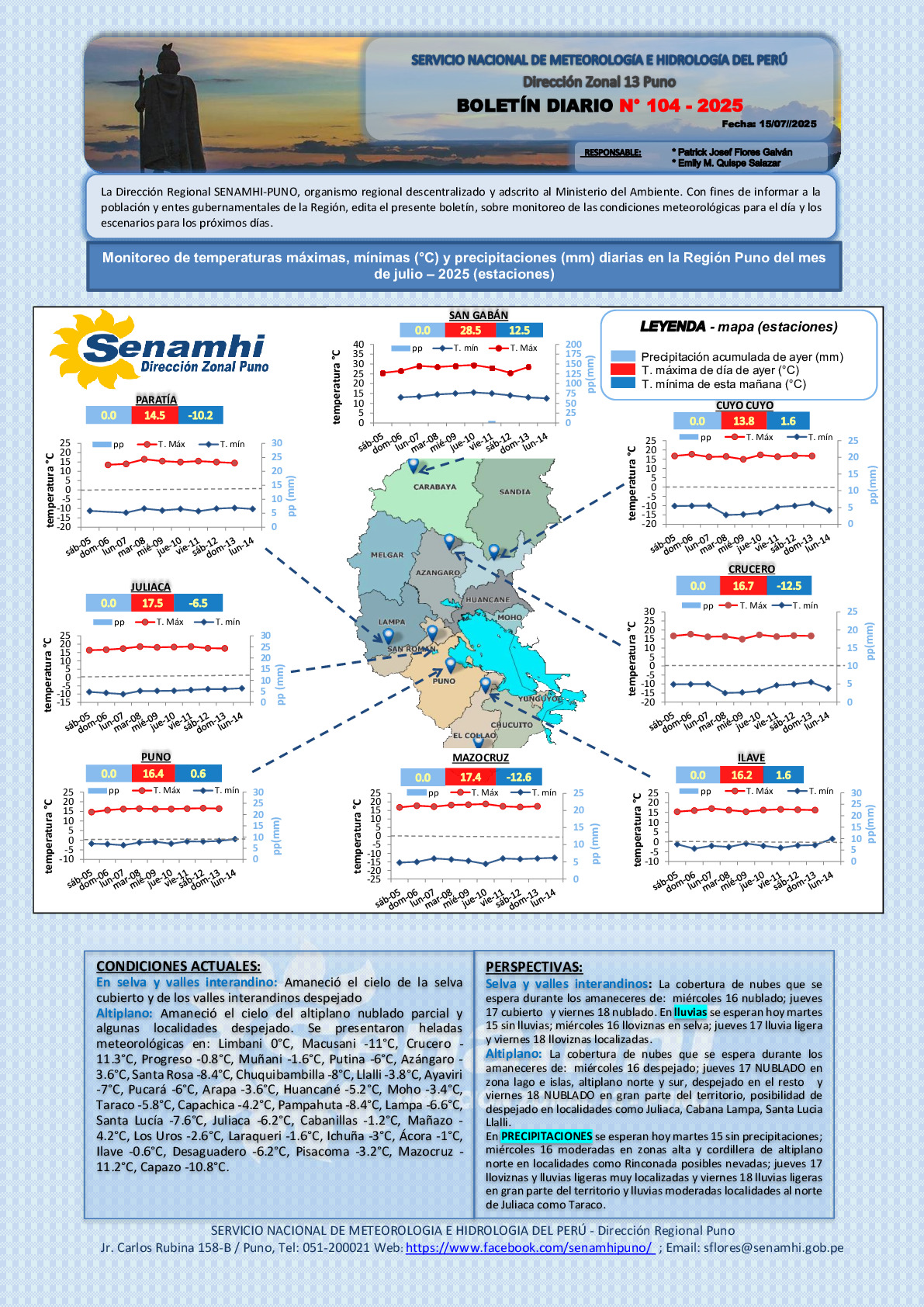 BOLETÍN HIDROMETEOROLÓGICO DIARIO DE LA REGIÓN DE PUNO PARA EL 15 julio 2025