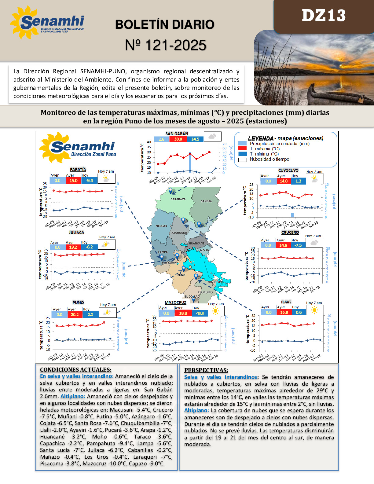 La Dirección Regional SENAMHI PUNO, organismo regional descentralizado y adscrito al Ministerio del Ambiente. Con fines de informar a la población y entes gubernamentales de la Región, edita el presente boletín, sobre monitoreo de las condiciones meteorológicas para el día y los escenarios para los próximos días.