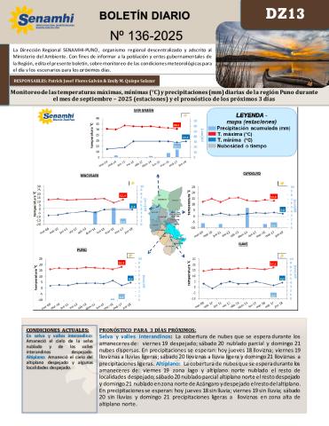 La Dirección Regional SENAMHI-PUNO, organismo regional descentralizado y adscrito al Ministerio del Ambiente. Con fines de informar a la población y entes gubernamentales de la Región, edita el presente boletín, sobre monitoreo de las condiciones meteorológicas para el día y los escenarios para los próximos días.