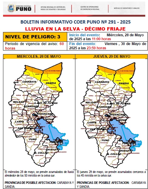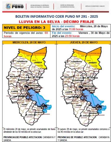 BOLETIN INFORMATIVO COER PUNO Nº 291 - 2025 LLUVIA EN LA SELVA - DÉCIMO FRIAJE