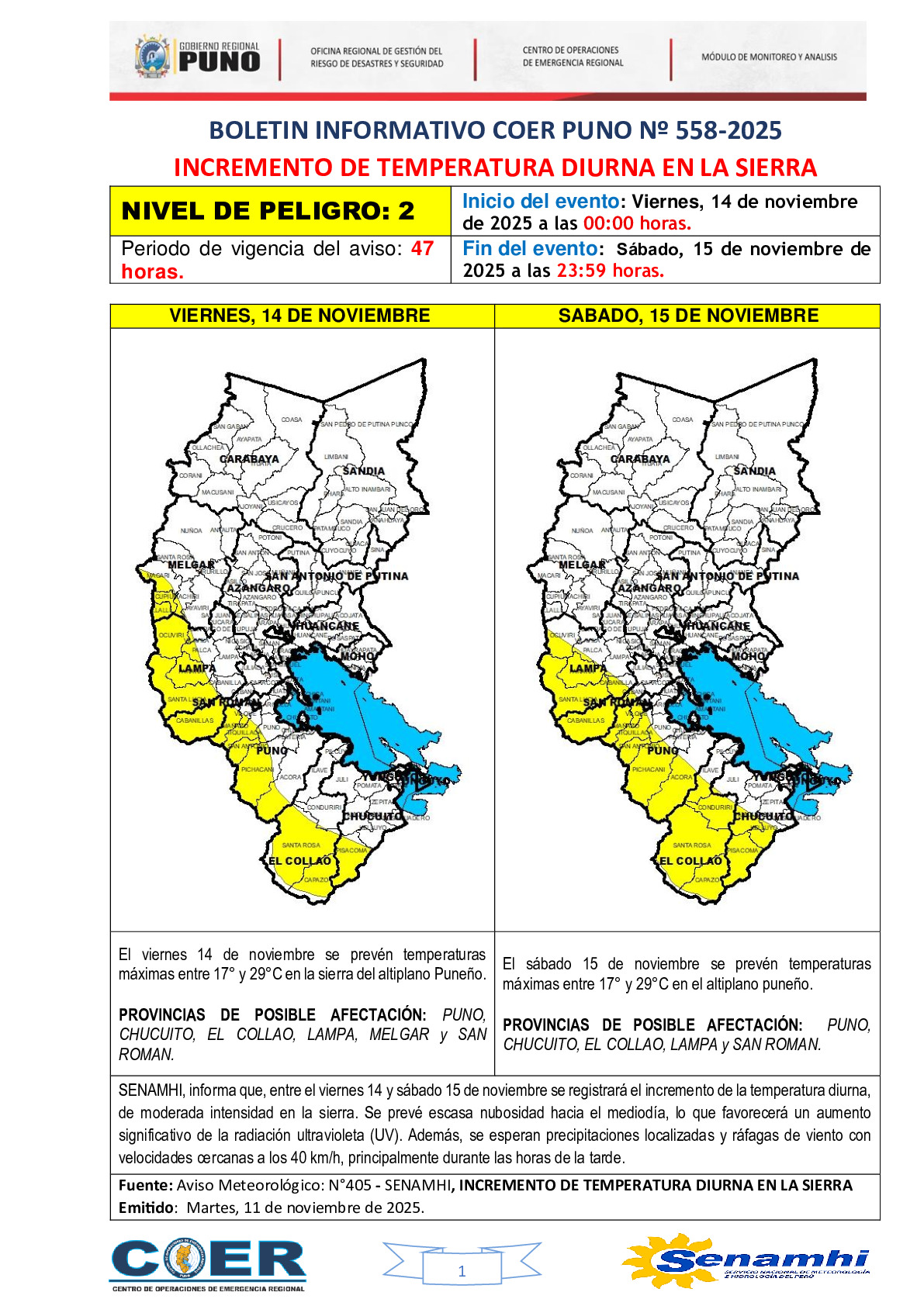 INCREMENTO DE TEMPERATURA DIURNA EN LA SIERRA: Inicio del evento: Viernes, 14 de noviembre de 2025 a las 00:00 horas.