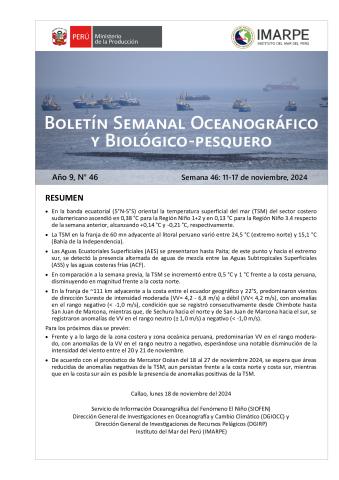 Boletín semanal oceanográfico y biológico pesquero N° 46 del 11 al 17 de noviembre, donde las anomalía térmica en la Región Niño 1+2 ascendió en 0,38 °C respecto de la semana anterior, alcanzando +0,14 °C. Las Aguas Ecuatoriales Superficiales (AES) se presentaron hasta Paita; de este punto y hacia el extremo sur, se detectó la presencia alternada de aguas de mezcla entre las Aguas Subtropicales Superficiales (ASS) y las aguas costeras frías (ACF).