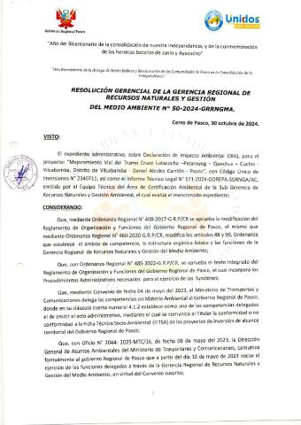 Según R.G. N° 050-2024-GRRNGMA se dio la Certificación Ambiental de la Declaración de Impacto Ambiental (DIA) del proyecto: “Mejoramiento Vial del Tramo Cruce Lutacocha-Patarayog-Quechca-Cuchis-Vilcabamba, Distrito de Vilcabamba - Daniel Alcides Carrión – Pasco”, con Código Único de Inversiones N° 2340711.