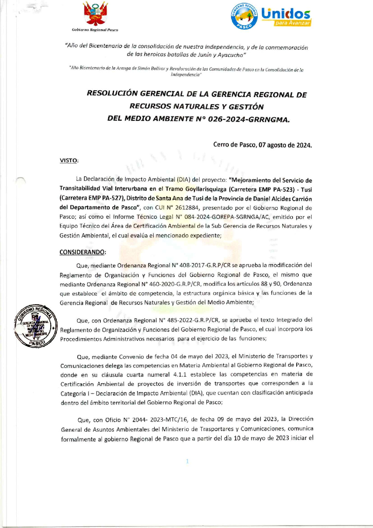Según R.G. N° 026-2024-GRRNGMA se dio la Certificación Ambiental de la Declaración de Impacto Ambiental (DIA) del proyecto: “MEJORAMIENTO DEL SERVICIO DE TRANSITABILIDAD VIAL INTERURBANA EN EL TRAMO GOYLLARISQUIZGA (CARRETERA EMP PA-523) - TUSI (CARRETERA EMP PA-527) DISTRITO DE SANTA ANA DE TUSI DE LA PROVINCIA DE DANIEL ALCIDES CARRION DEL DEPARTAMENTO DE PASCO”, con Código Único de Inversiones N° 2612884.