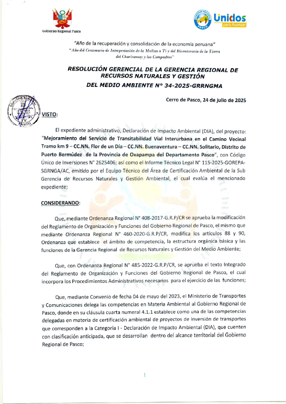 Según Informe Técnico Legal N° 115-2025-GOREPA-SGRNGA/AC y Resolución Gerencial N° 034-2025-GRRNGMA se dio la Certificación Ambiental de la Declaración de Impacto Ambiental (DIA) del proyecto: “Mejoramiento del Servicio de Transitabilidad Vial Interurbana en el Camino Vecinal Tramo KM 9 – CC.NN. Flor de un Día – CC.NN. Buenaventura – CC.NN. Solitario, Distrito de Puerto Bermúdez de la Provincia de Oxapampa del Departamento de Pasco”, con Código Único de Inversiones N° 2625406.