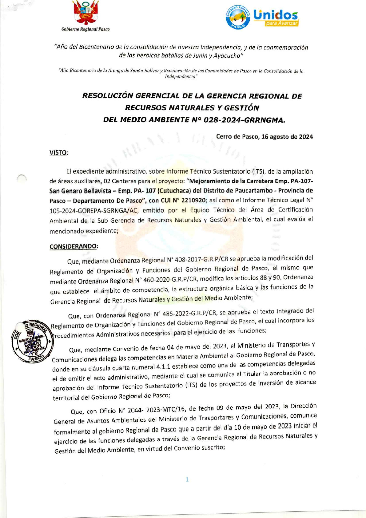 Según Informe Técnico Legal N° 105-2024-GOREPA-SGRNGA/AC y Resolución Gerencial N° 028-2024-GRRNGMA se dio la Certificación Ambiental al Informe Técnico Sustentatorio (ITS) del proyecto: “Mejoramiento de la Carretera Emp. PA-107 - San Genaro - Bellavista - Emp. PA-107 (Cutuchaca) del Distrito de Paucartambo - Provincia de Pasco - Departamento de Pasco”, con Código Único de Inversiones N° 2210920.