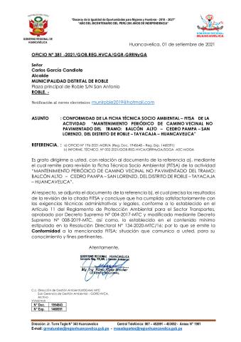 Conformidad de la Ficha Técnica Socio Ambiental – FITSA de la Actividad “Mantenimiento Periódico de Camino Vecinal NO Pavimentado del Tramo: Balcón Alto – Cedro Pampa – San Lorenzo, del Distrito de Roble – Tayacaja – Huancavelica”