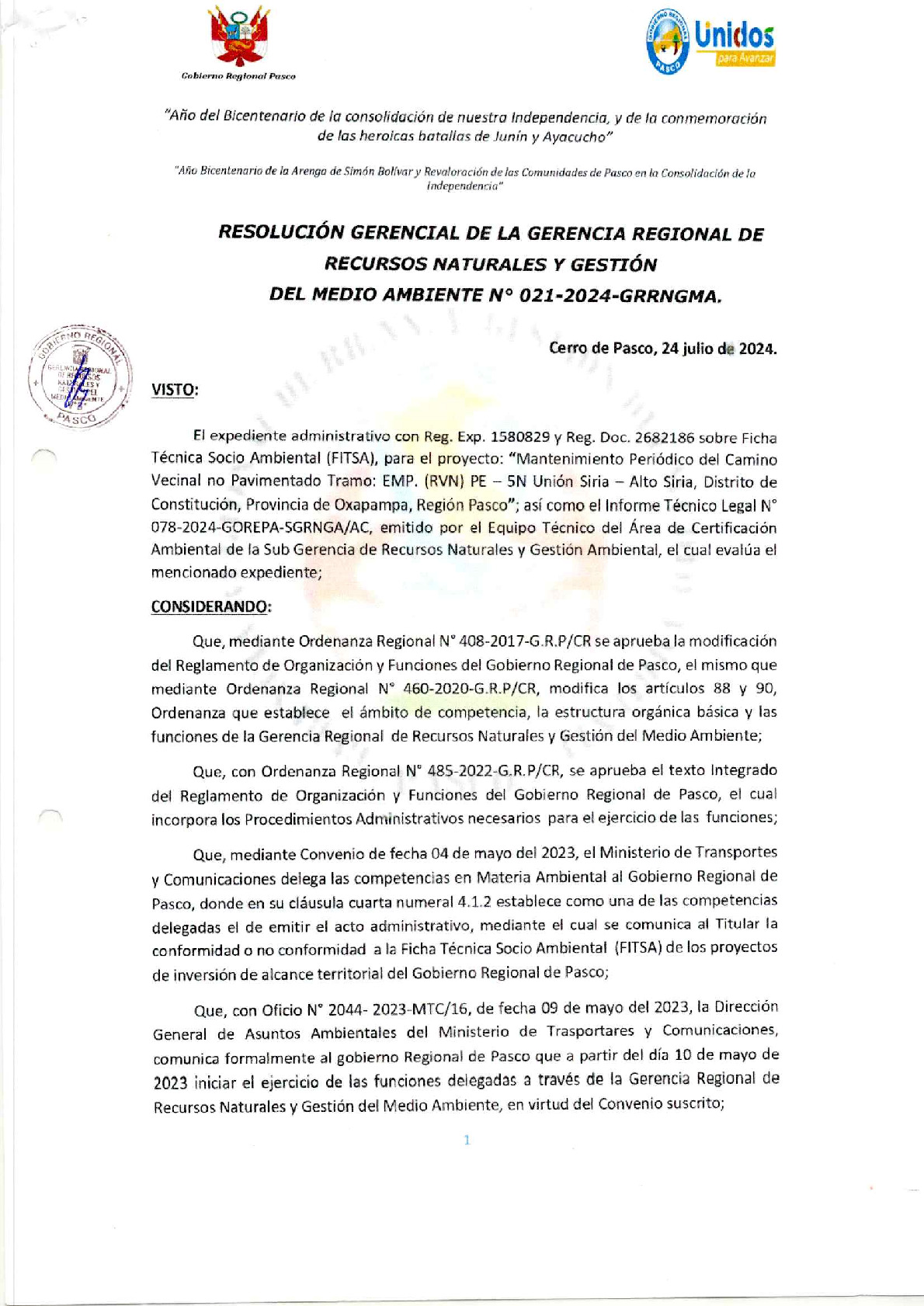 Según Informe Técnico Legal N° 078-2024-GOREPA-SGRNGA/AC y Resolución Gerencial N° 021-2024-GRRNGMA se dio Conformidad de la Ficha Técnica Socio Ambiental (FITSA) de la actividad: “Mantenimiento Periódico del Camino Vecinal No Pavimentado Tramo: Emp. (Rvn) PE - 5N – Unión Siria – Alto Siria, Distrito de Constitución, Provincia de Oxapampa, Región Pasco”.