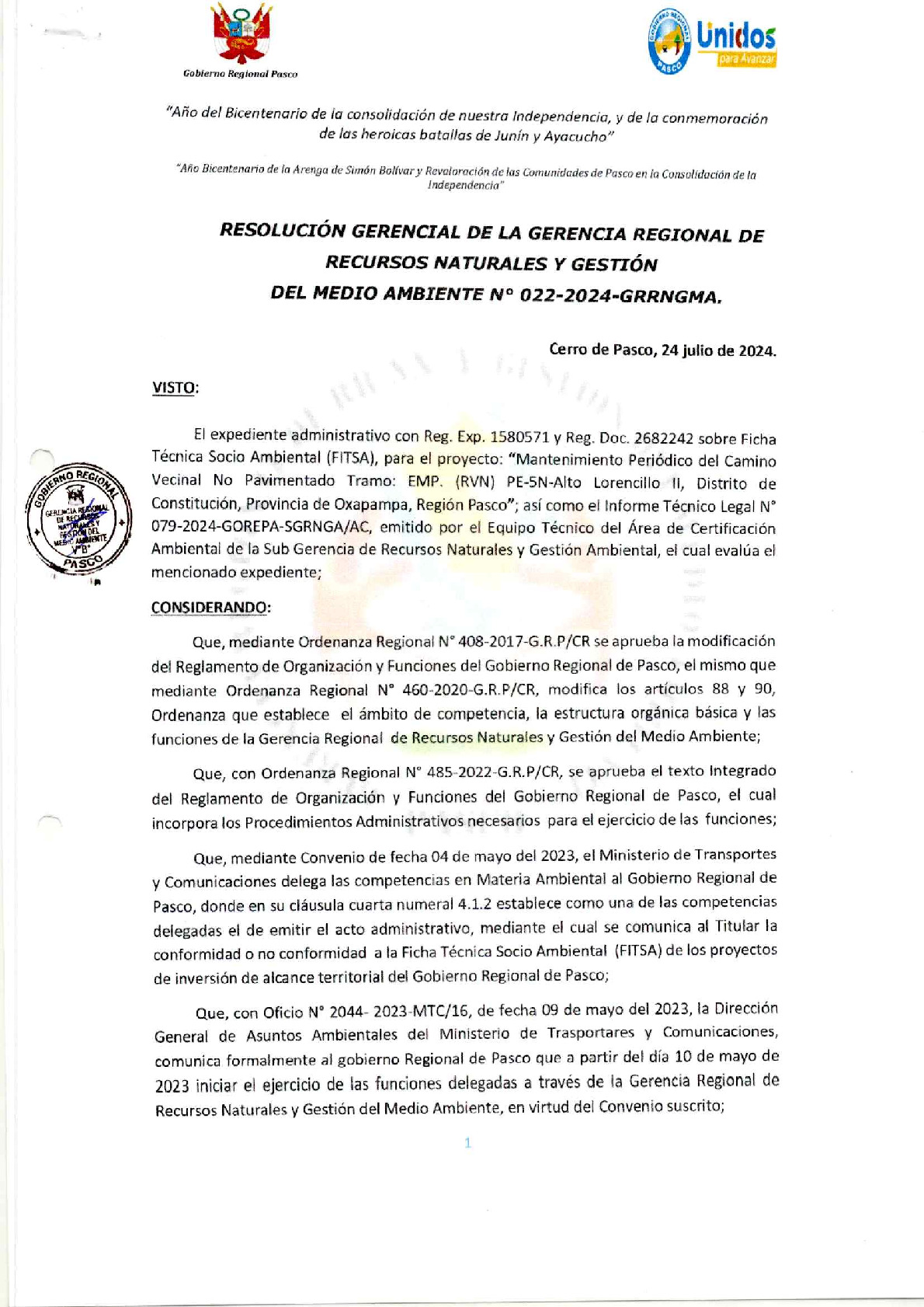 Según Informe Técnico Legal N° 079-2024-GOREPA-SGRNGA/AC y Resolución Gerencial N° 022-2024-GRRNGMA se dio Conformidad de la Ficha Técnica Socio Ambiental (FITSA) de la actividad: “Mantenimiento Periódico del Camino Vecinal No Pavimentado Tramo: Emp. (Rvn) PE-5N-Alto Lorencillo II, del Distrito de Constitución, Provincia de Oxapampa, Región Pasco”.