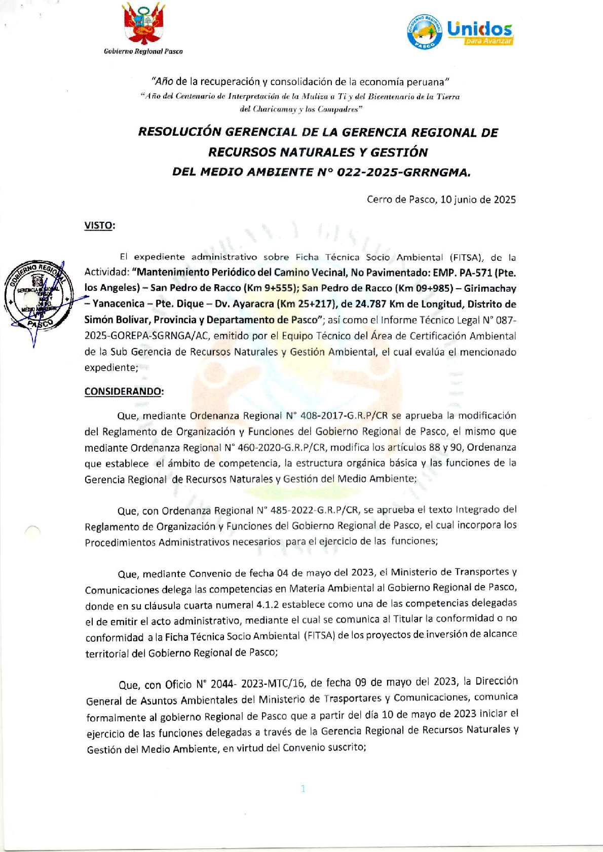 Según Informe Técnico Legal N° 087-2025-GOREPA-SGRNGA/AC y Resolución Gerencial N° 022-2025-GRRNGMA se dio Conformidad la Ficha Técnica Socio Ambiental (FITSA) de la actividad: “Mantenimiento Periódico del Camino Vecinal, No Pavimentado: Emp. PA-571 (Pte. Los Angeles) - San Pedro de Racco (Km 9+555); San Pedro de Racco (Km 09+985) - Girimachay - Yanacenica - Pte. Dique - Dv. Ayaracra (Km 25+217), de 24.787 Km de Longitud, Distrito de Simón Bolívar, Provincia y Departamento de Pasco”.