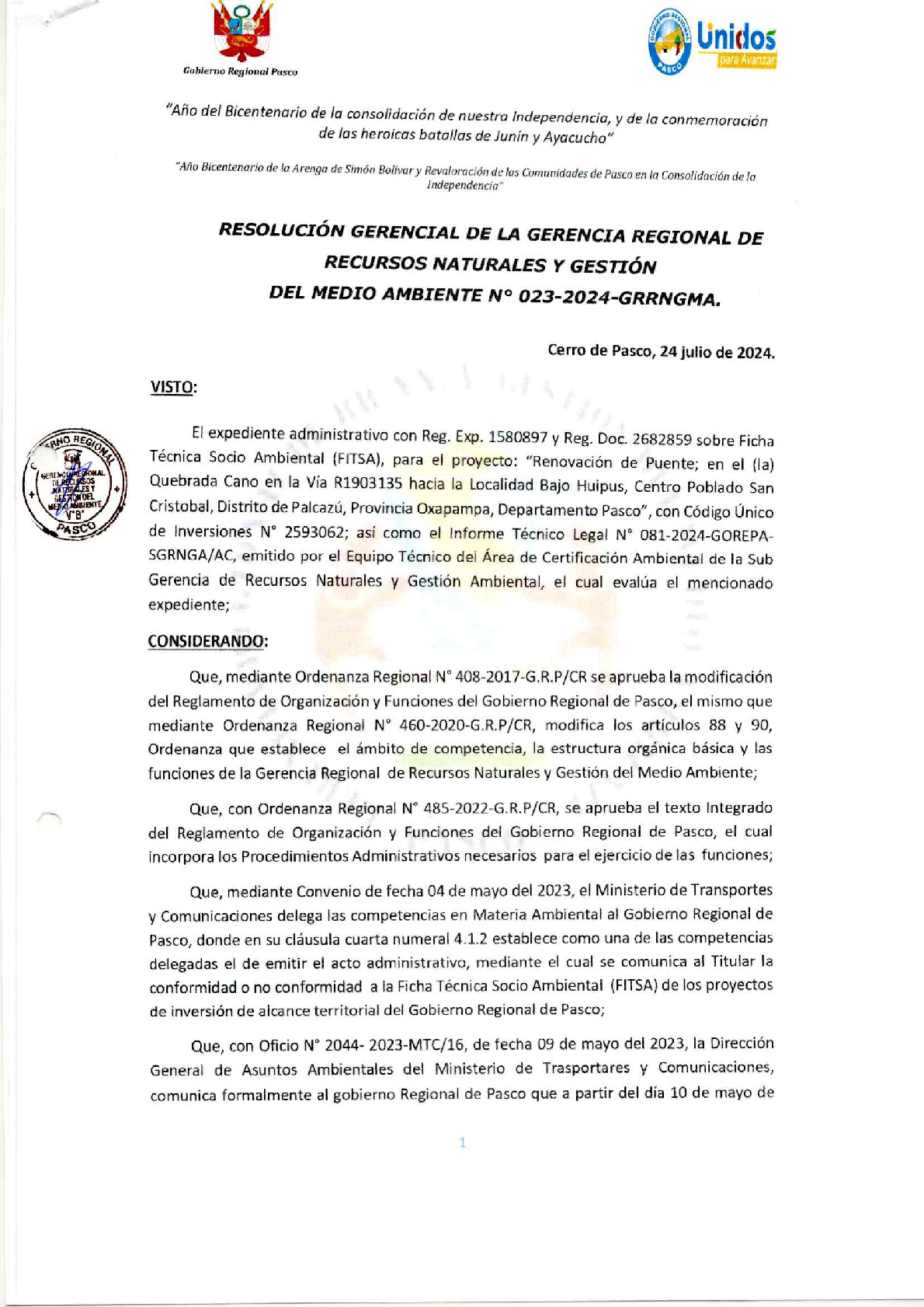 Según Informe Técnico Legal N° 081-2024-GOREPA-SGRNGA/AC y Resolución Gerencial N° 023-2024-GRRNGMA se dio Conformidad de la Ficha Técnica Socio Ambiental (FITSA) de la IOARR: “Renovación de Puente; En El(La) Quebrada Cano en la Vía R1903135 Hacia la Localidad Bajo Huipus, Centro Poblado San Cristóbal, Distrito de Palcazú, Provincia Oxapampa, Departamento Pasco”.