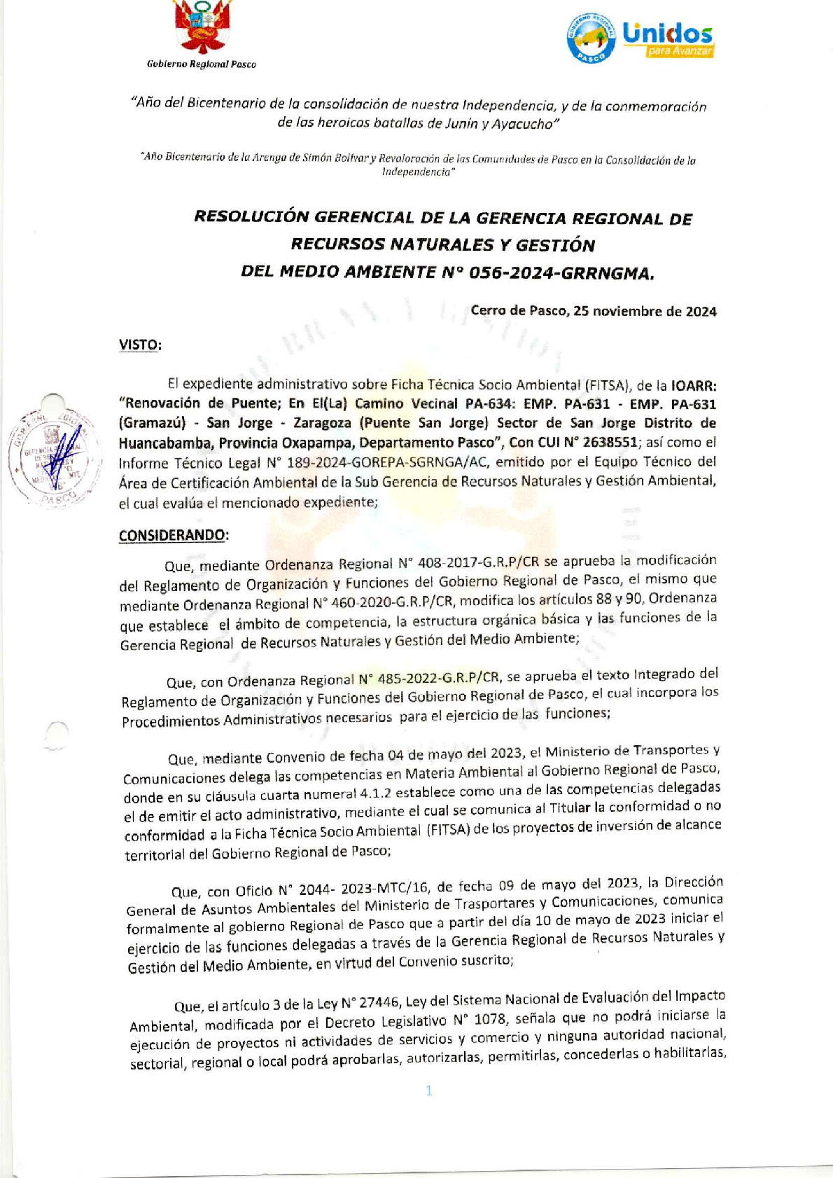 Según Informe Técnico Legal N° 0189-2024-GOREPA-SGRNGA/AC y Resolución Gerencial N° 056-2024-GRRNGMA se dio Conformidad la Ficha Técnica Socio Ambiental (FITSA) de la IOARR: “Renovación de Puente; En El(La) Camino Vecinal PA-634: Emp. PA-631 - Emp. PA-631(Gramazú) - San Jorge - Zaragoza (Puente San Jorge) Sector de San Jorge Distrito de Huancabamba, Provincia Oxapampa, Departamento Pasco”, con Código Único de Inversiones N° 2638551.