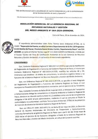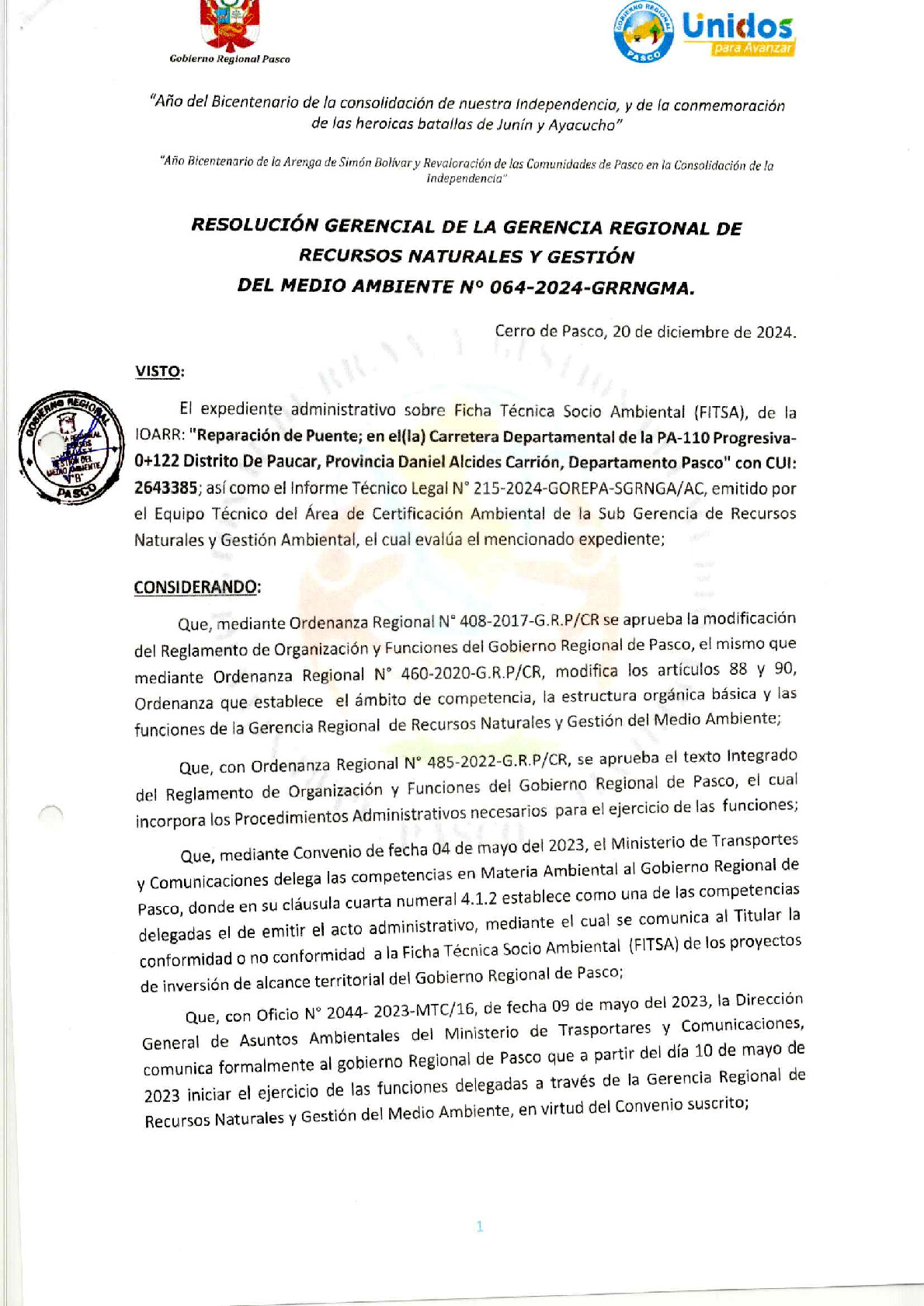 Según Informe Técnico Legal N° 0215-2024-GOREPA-SGRNGA/AC y Resolución Gerencial N° 064-2024-GRRNGMA se dio Conformidad la Ficha Técnica Socio Ambiental (FITSA) de la IOARR: “Reparación de Puente; En El(La) Carretera Departamental de la PA-110 Progresiva-0+122 Distrito de Paucar, Provincia Daniel Alcides Carrión, Departamento Pasco", con Código Único de Inversiones N° 2643385.