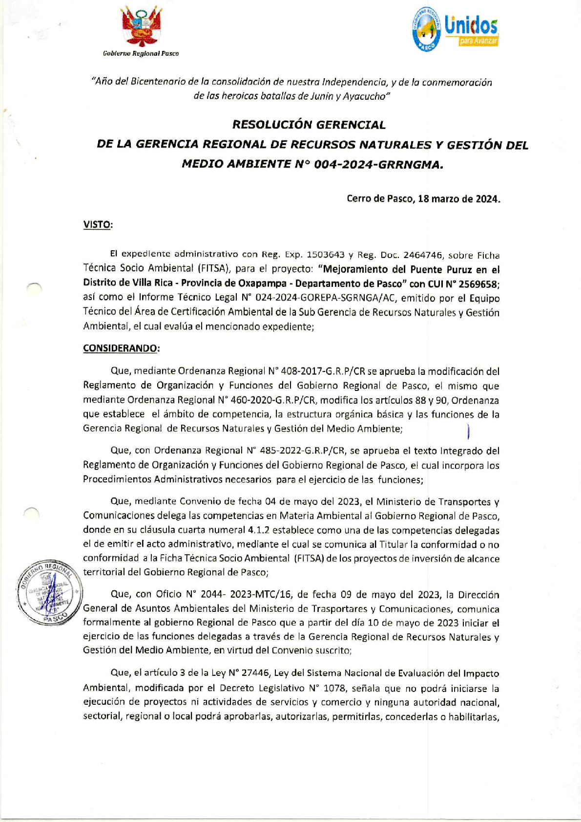 Según R.G. N° 004-2024-GRRNGMA se dio conformidad de la Ficha Técnica Socio Ambiental (FITSA) del proyecto: “MEJORAMIENTO DEL PUENTE PURUZ EN EL DISTRITO DE VILLA RICA - PROVINCIA DE OXAPAMPA - DEPARTAMENTO DE PASCO”, con Código Único de Inversiones N° 2569658.