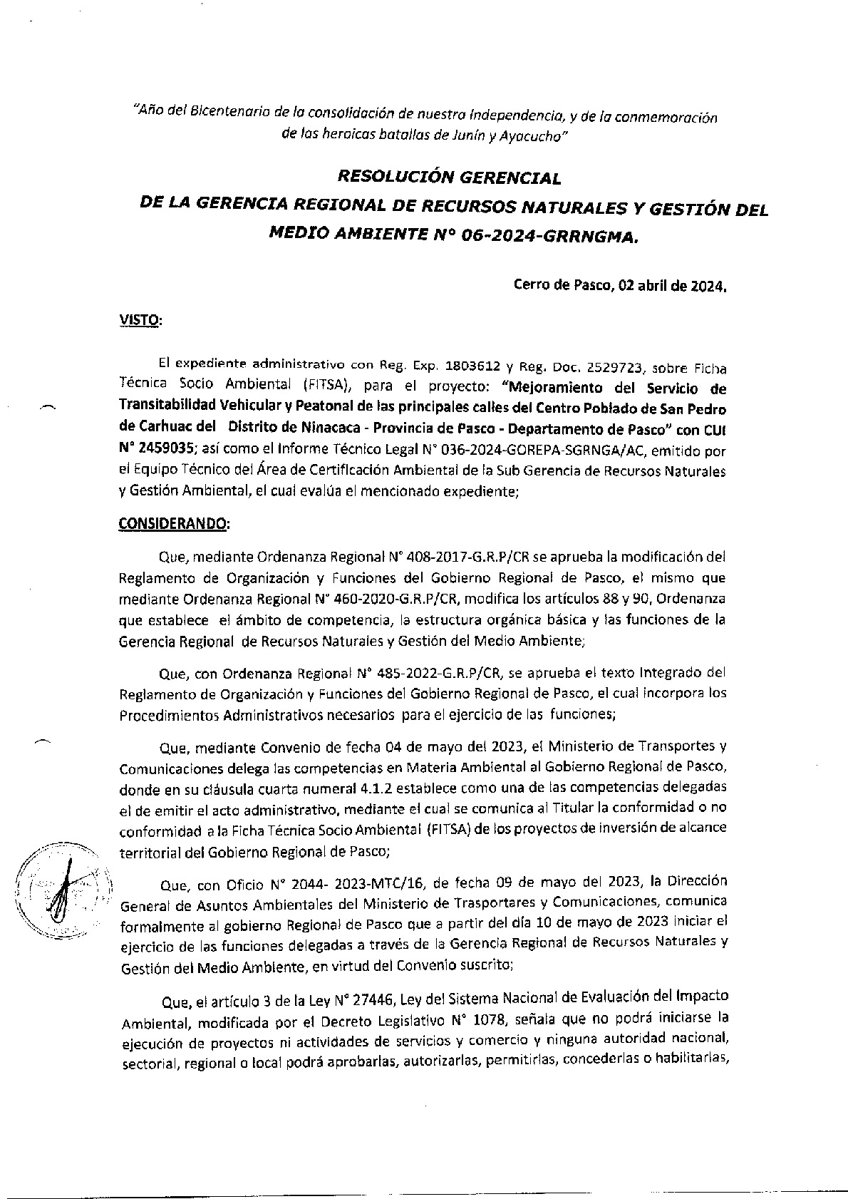 Según R.G. N°006-2024-GRRNGMA se dio conformidad de la Ficha Técnica Socio Ambiental (FITSA) del proyecto: “MEJORAMIENTO DEL SERVICIO DE TRANSITABILIDAD VEHICULAR Y PEATONAL DE LAS PRINCIPALES CALLES DEL CENTRO POBLADO SAN PEDRO DE CARHUAC DEL DISTRITO DE NINACACA - PROVINCIA DE PASCO - DEPARTAMENTO DE PASCO”, con Código Único de Inversiones N° 2459035.