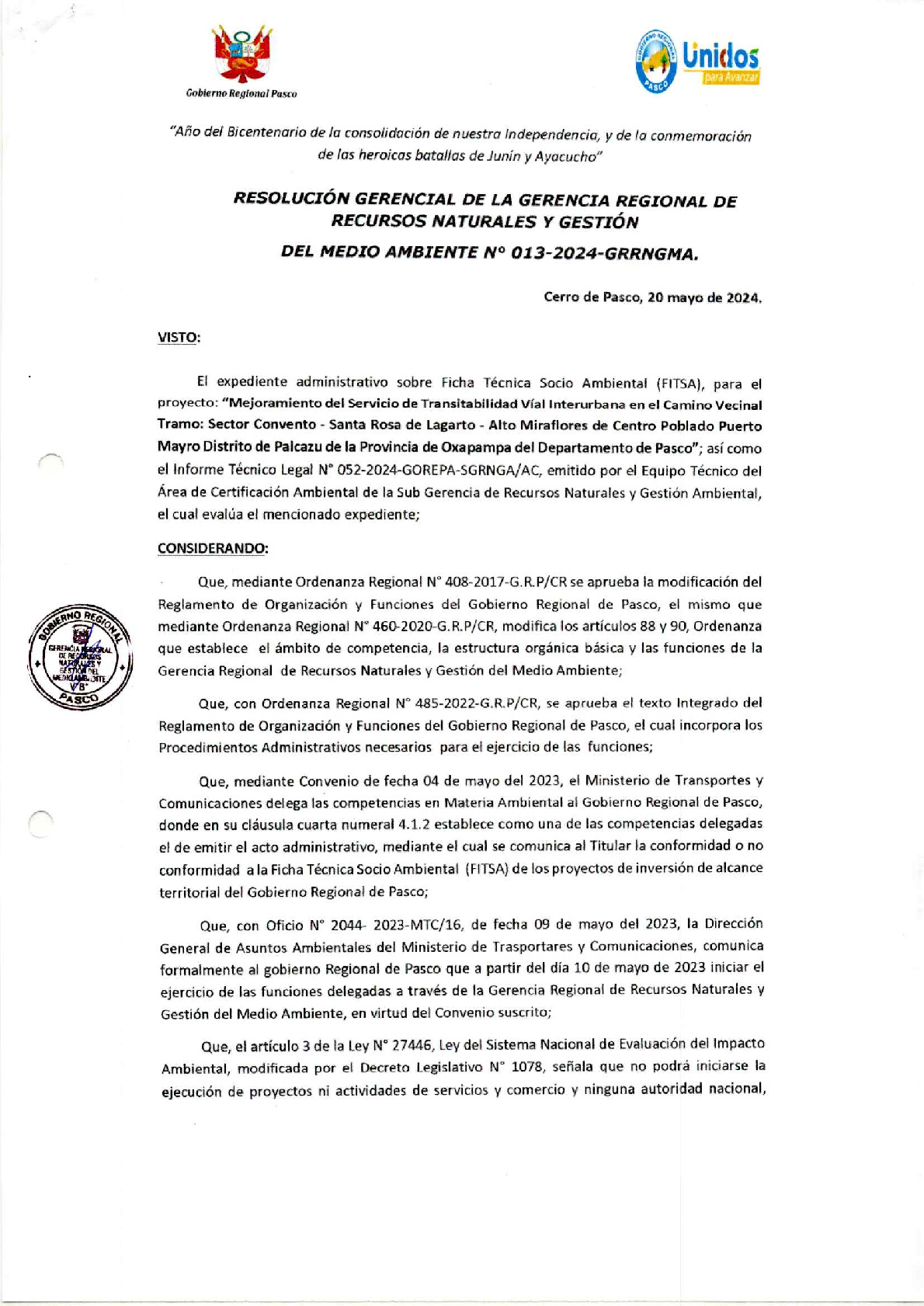 Según R.G. N° 013-2024-GRRNGMA se dio Conformidad de la Ficha Técnica Socio Ambiental (FITSA) del proyecto: “Mejoramiento del Servicio de Transitabilidad Vial Interurbana en Camino Vecinal Tramo: Sector Convento- Santa Rosa de Lagarto- Alto Miraflores de Centro Poblado Puerto Mayro Distrito de Palcazu de la Provincia de Oxapampa del Departamento de Pasco”.