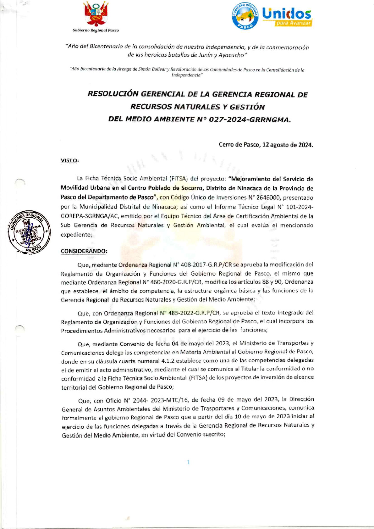 Según Informe Técnico Legal N° 0101-2024-GOREPA-SGRNGA/AC y Resolución Gerencial N° 027-2024-GRRNGMA se dio Conformidad la Ficha Técnica Socio Ambiental (FITSA) del proyecto: “Mejoramiento del Servicio de Movilidad Urbana en el Centro Poblado de Socorro Distrito de Ninacaca de la Provincia de Pasco del Departamento de Pasco”.