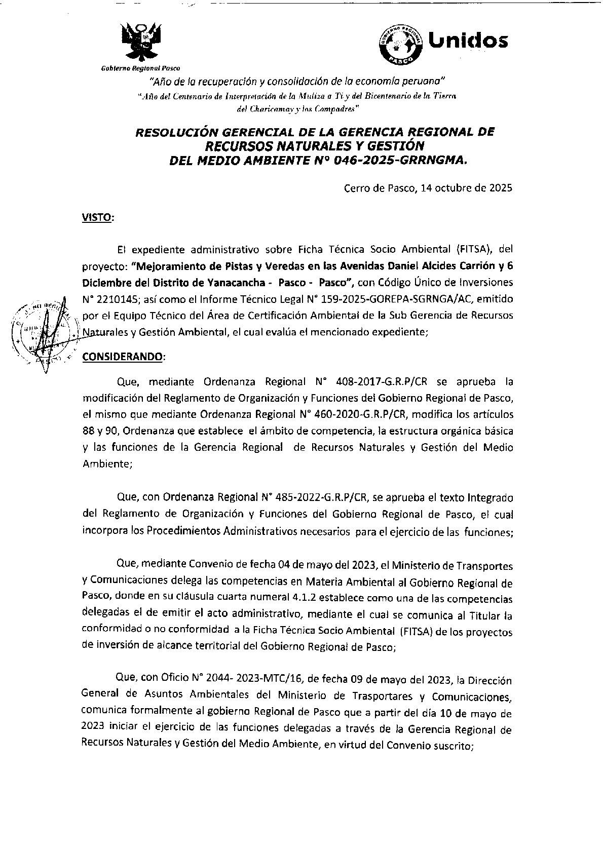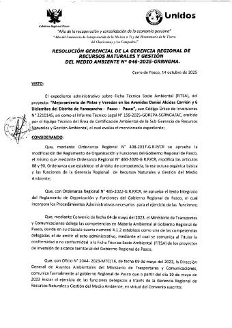 Según Informe Técnico Legal N° 0159-2025-GOREPA-SGRNGA/AC y Resolución Gerencial N° 046-2025-GRRNGMA se dio Conformidad de la Ficha Técnica Socio Ambiental (FITSA) del Proyecto: “Mejoramiento de Pistas y Veredas en las Avenidas Daniel Alcides Carrión y 6 de diciembre del, Distrito de Yanacancha - Pasco – Pasco”, con Código Único de Inversiones N° 2210145.
