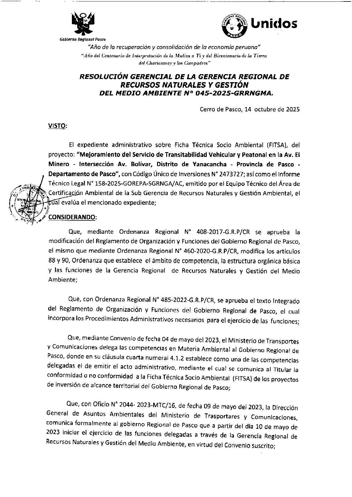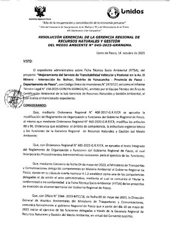 Según Informe Técnico Legal N° 0158-2025-GOREPA-SGRNGA/AC y Resolución Gerencial N° 045-2025-GRRNGMA se dio Conformidad la Ficha Técnica Socio Ambiental (FITSA) del Proyecto: "Mejoramiento del Servicio de Transitabilidad Vehicular y Peatonal en la Av. El Minero - Intersección Av. Bolívar, Distrito de Yanacancha - Provincia de Pasco - Departamento de Pasco", con Código Único de Inversiones N° 2473727.