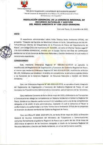 Según Informe Técnico Legal N° 218-2025-GOREPA-SGRNGA/AC y Resolución Gerencial N° 056-2025-GRRNGMA se dio Conformidad la Ficha Técnica Socio Ambiental (FITSA) del Proyecto: “Creación del Servicio de Movilidad Urbana en la Av. Tahuantinsuyo del AA.HH. Tahuantinsuyo Distrito de Chaupimarca de la Provincia de Pasco del Departamento de Pasco”, con Código Único de Inversiones N° 2626000.