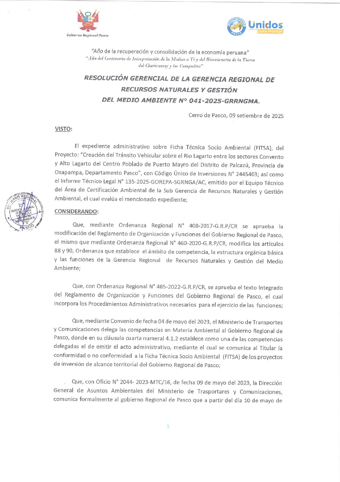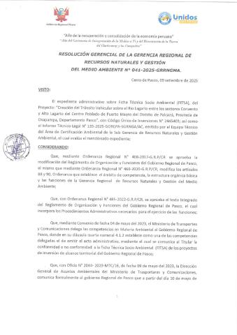 Según Informe Técnico Legal N° 0135-2025-GOREPA-SGRNGA/AC y Resolución Gerencial N° 041-2025-GRRNGMA se dio Conformidad de la Ficha Técnica Socio Ambiental (FITSA) del Proyecto: "Creación del Tránsito Vehicular Sobre el Rio Lagarto entre los Sectores Convento y Alto Lagarto del Centro Poblado de Puerto Mayro del Distrito de Palcazu - Provincia de Oxapampa - Departamento de Pasco", con Código Único de Inversiones N° 2445403.