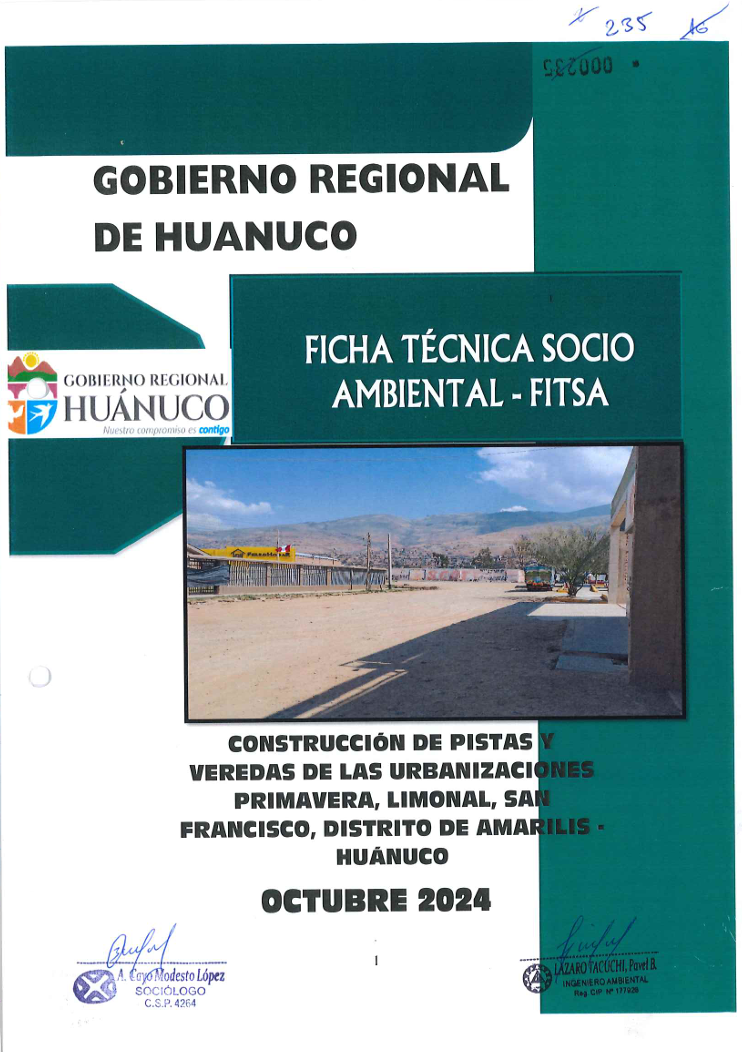 El objetivo general de la presente Ficha Técnica Socio Ambiental (FITSA) es establecer medidas de adecuación, mitigación y/o manejo ambiental necesarias para la gestión de los impacto ambientales y sociales ocasionados por la construcción del proyecto "Construcción de pistas y veredas de las urbanizaciones Primavera, Limonal, San Francisco, distrito de Amarilis -Huánuco", en concordancia con la legislación vigente y de forma sostenible y participativa.