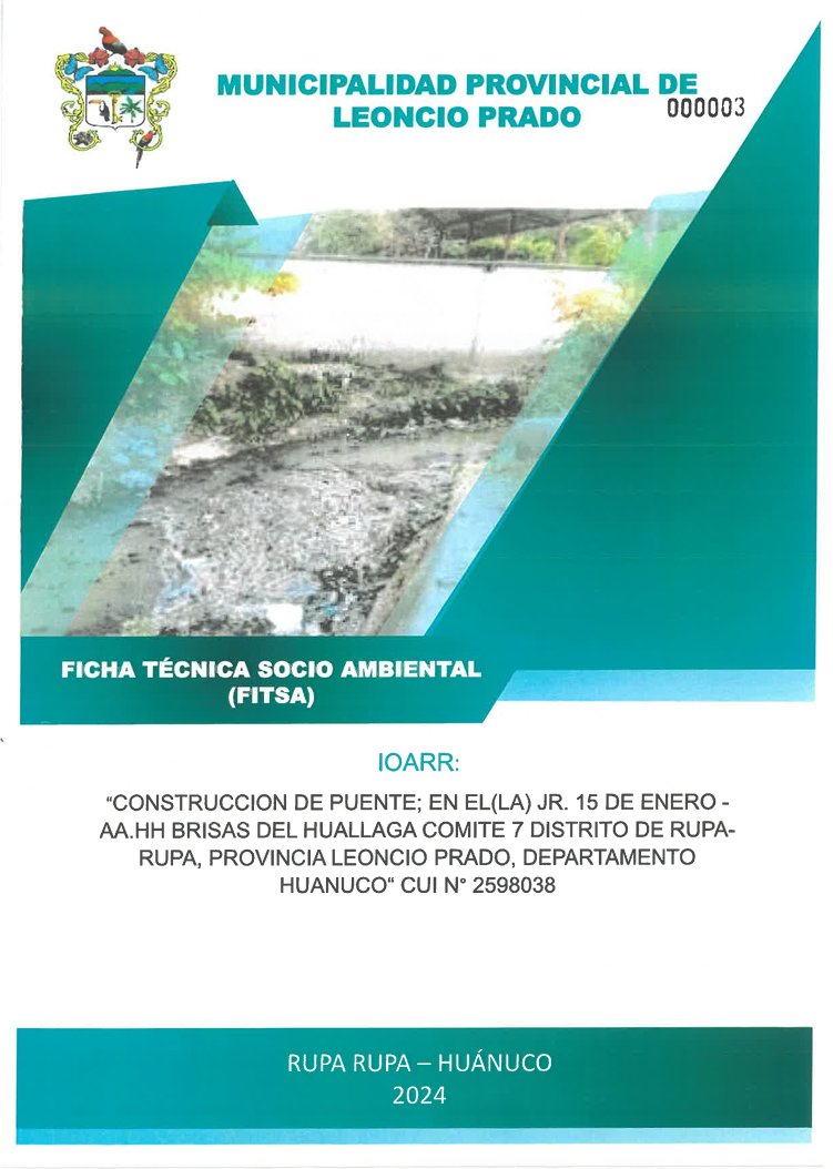Elaborar la Ficha Técnica Socio Ambiental (FITSA) que permita Identificar y caracterizar los impactos ambientales y socio económicos que pudieran derivarse de la implementación del IOARR: "CONSTRUCCIÓN DE PUENTE; EN EL(LA) JR. 15 DE ENERO - AA. HH BRISAS DEL HUALLAGA COMITÉ 7 DISTRITO DE RUPA-RUPA, PROVINCIA LEONCIO PRADO, DEPARTAMENTO HUÁNUCO" los medios: físico, biológico y socio económico, especificando medidas para prevenir, mitigar, corregir o compensar los impactos negativos.