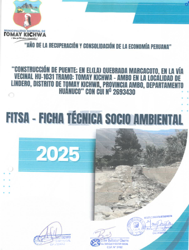 "Construcción de puente; en el(la) quebrada Marcacoto, en la vía vecinal hu-1031 tramo: Tomay Kichwa-Ambo en la localidad de lindero, distrito de Tomay Kichwa, provincia Ambo, departamento Huánuco" con cui N° 2693430