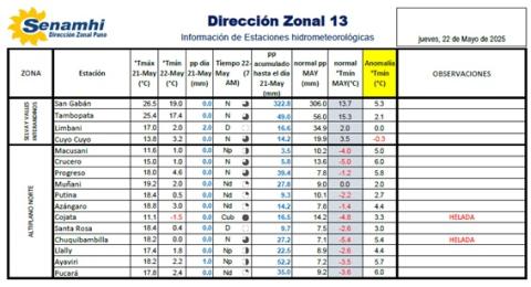 Datos hidrometeorológicos de la DZ13 – Puno del 22/05/2025