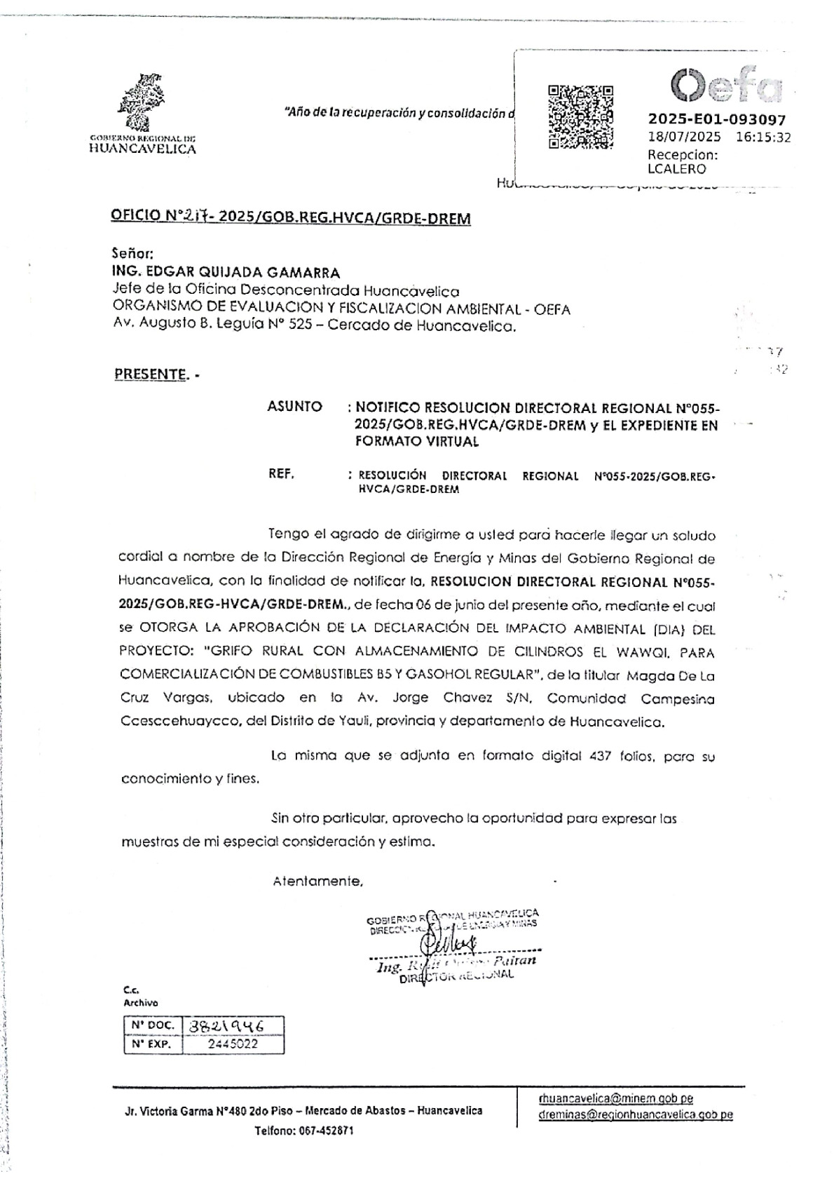 Declaración de Impacto Ambiental (DIA) del Proyecto: "Grifo Rural con almacenamiento de Cilindros el WAWQI, para Comercialización de Combustibles B5 y Gasohol Regular"