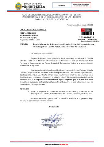 El presente documento corresponde a información remitida por la municipalidad al Ministerio del Ambiente en cumplimiento de lo establecido en el Decreto Legislativo N° 1055 que modifica el artículo 43° de la Ley N° 28611, que indica que "Las entidades deberán enviar anualmente un listado con las denuncias recibidas y soluciones alcanzadas, con la finalidad de hacer pública esta información a la población a través del SINIA".