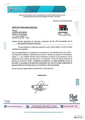 En cumplimiento de lo establecido en el Decreto Legislativo N° 1055 que modifica el artículo 43° de la Ley N° 28611, que indica que "Las entidades deberán enviar anualmente un listado con las denuncias recibidas y soluciones alcanzadas, con la finalidad de hacer pública esta información a la población a través del SINIA".