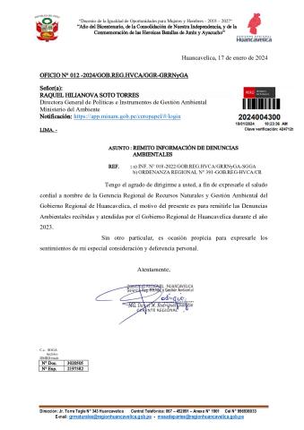 La entidad remite al Ministerio del Ambiente información sobre las denuncias ambientales en cumplimiento de lo establecido en el Decreto Legislativo N° 1055 que modifica el artículo 43° de la Ley N° 28611, que indica que "Las entidades deberán enviar anualmente un listado con las denuncias recibidas y soluciones alcanzadas, con la finalidad de hacer pública esta información a lav población a través del SINIA".