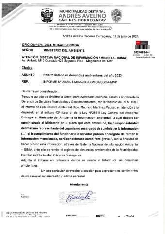 En cumplimiento de lo establecido en el Decreto Legislativo N° 1055 que modifica el artículo 43° de la Ley N° 28611, que indica que "Las entidades deberán enviar anualmente un listado con las denuncias recibidas y soluciones alcanzadas, con la finalidad de hacer pública esta información a la población a través del SINIA".