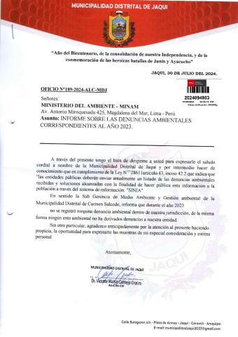 En cumplimiento de lo establecido en el Decreto Legislativo N° 1055 que modifica el artículo 43° de la Ley N° 28611, que indica que "Las entidades deberán enviar anualmente un listado con las denuncias recibidas y soluciones alcanzadas, con la finalidad de hacer pública esta información a la población a través del SINIA".