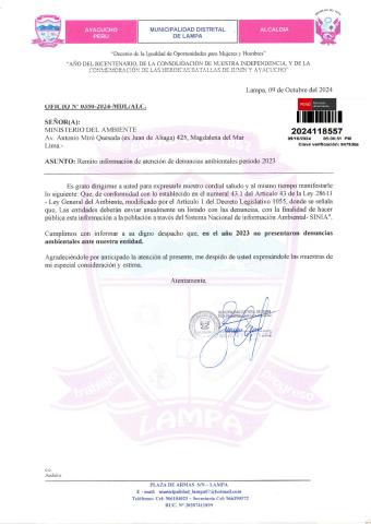 En cumplimiento de lo establecido en el Decreto Legislativo N° 1055 que modifica el artículo 43° de la Ley N° 28611, que indica que "Las entidades deberán enviar anualmente un listado con las denuncias recibidas y soluciones alcanzadas, con la finalidad de hacer pública esta información a la población a través del SINIA".