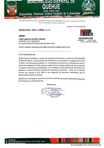 En cumplimiento de lo establecido en el Decreto Legislativo N° 1055 que modifica el artículo 43° de la Ley N° 28611, que indica que "Las entidades deberán enviar anualmente un listado con las denuncias recibidas y soluciones alcanzadas, con la finalidad de hacer pública esta información a la población a través del SINIA".
