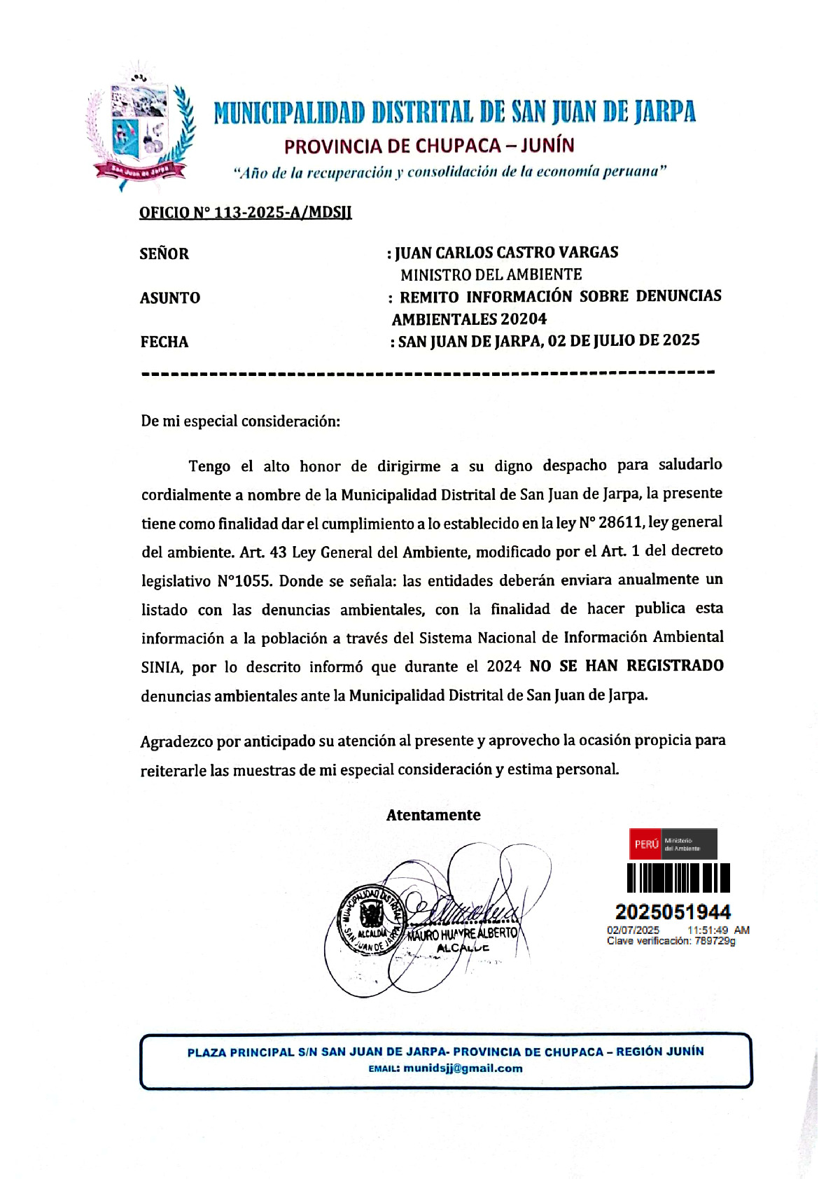 En cumplimiento de lo establecido en el Decreto Legislativo N° 1055 que modifica el artículo 43° de la Ley N° 28611, que indica que "Las entidades deberán enviar anualmente un listado con las denuncias recibidas y soluciones alcanzadas, con la finalidad de hacer pública esta información a la población a través del SINIA".