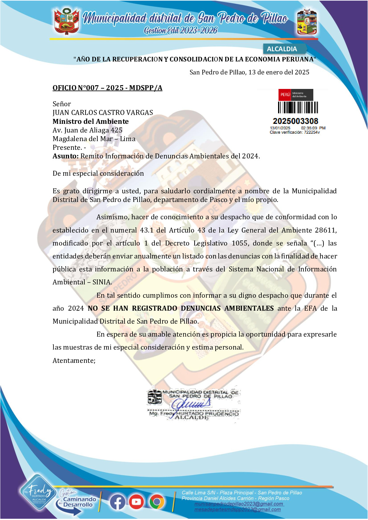 En cumplimiento de lo establecido en el Decreto Legislativo N° 1055 que modifica el artículo 43° de la Ley N° 28611, que indica que "Las entidades deberán enviar anualmente un listado con las denuncias recibidas y soluciones alcanzadas, con la finalidad de hacer pública esta información a la población a través del SINIA".
