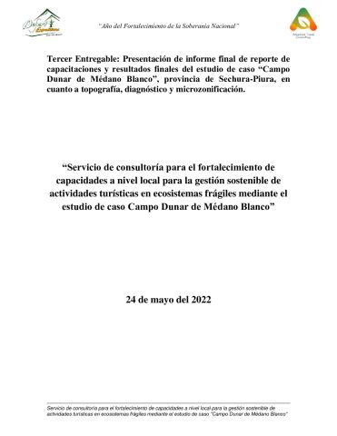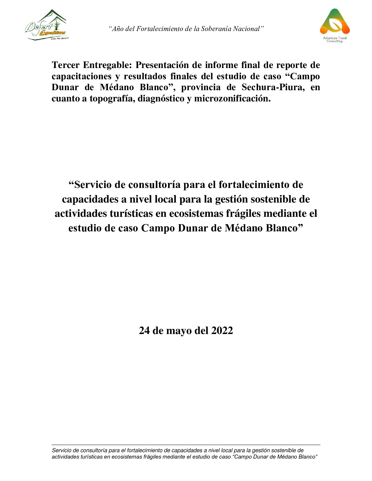 El informe "Servicio de consultoría para el fortalecimiento de capacidades a nivel local para la gestión sostenible de actividades turísticas en ecosistemas frágiles", basado en el caso del Campo Dunar de Médano Blanco en Sechura, Piura, Perú, analiza cómo promover un turismo sostenible en este ecosistema vulnerable. El diagnóstico turístico abarca aspectos como la topografía, el ambiente, la población local y la infraestructura disponible.