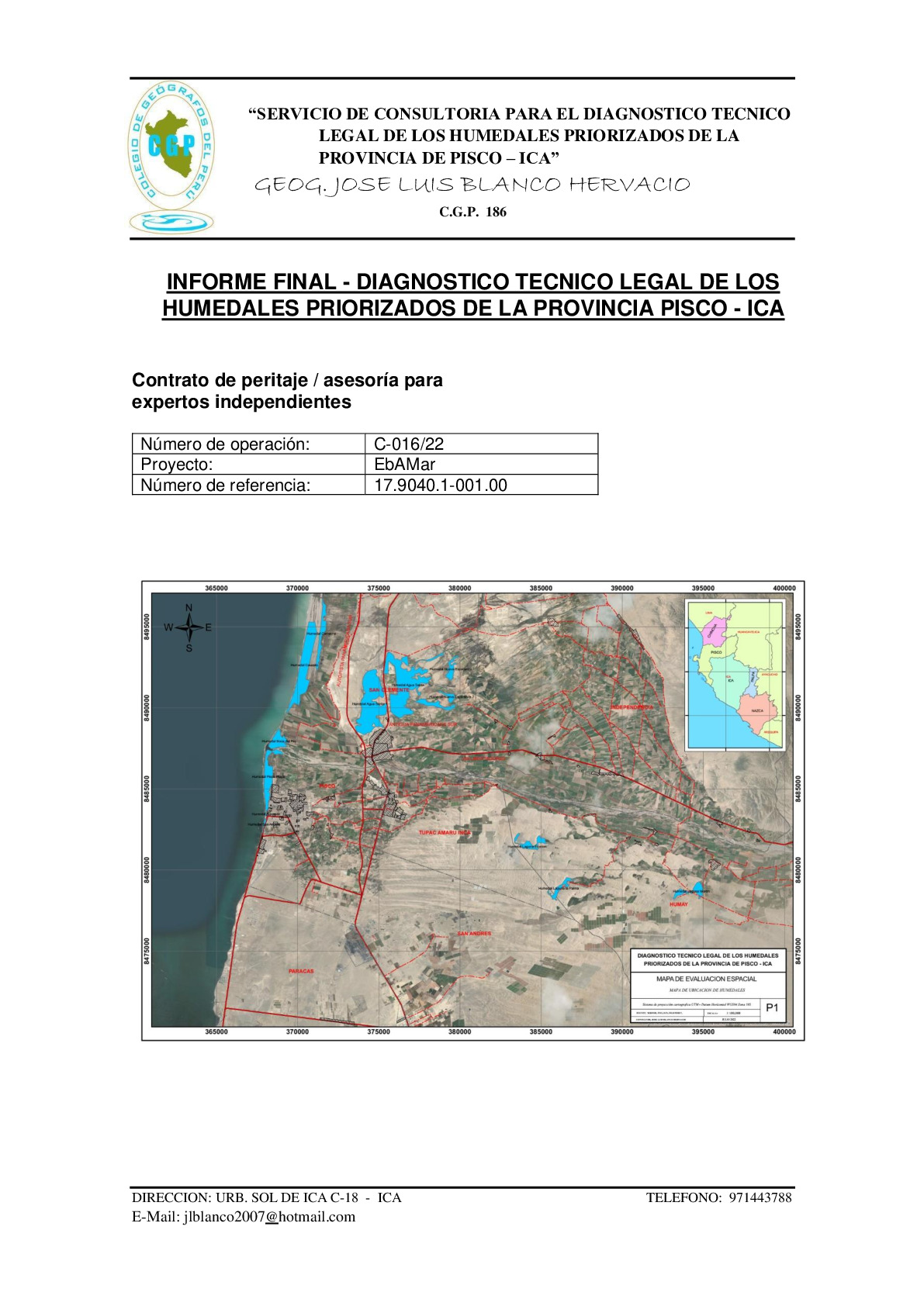 El Informe Final sobre el Diagnóstico Técnico Legal de los Humedales Priorizados en la Provincia de Pisco, Ica, realizado por el geógrafo José Luis Blanco Hervacio, tiene como objetivo proporcionar un diagnóstico detallado que apoye la toma de decisiones para la conservación y uso sostenible de estos ecosistemas. El informe evalúa 13 humedales, analizando aspectos clave como su ubicación, accesibilidad, estado legal, permisos y conflictos de uso.