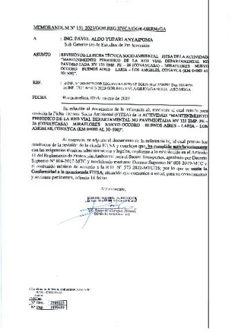 MEDIANTE EL INFORME TÉCNICO N° 013-2023.GOB.REG.HVCA/GRRyGA/SGGA, SE EMITE LA CONFORMIDAD DE LA FICHA TÉCNICA SOCIO AMBIENTAL – FITSA DE LA ACTIVIDAD “MANTENIMIENTO PERIODICO DE LA RED VIAL DEPARTAMENTAL NO PAVIMENTADA HV 125 EMP. PE - 26 (CONAYCASA) - MIRAFLORES - NUEVO OCCORO - BUENOS AIRES - LARIA - LOS ANGELES, CONAYCA (KM 0 + 000 AL 30 + 500)”.