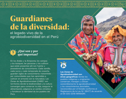 El brochure presenta la situación actual de las Zonas de Agrobiodiversidad (ZABD) en el Perú, introduce qué son las ZABD y porqué son importantes de conservarlas. Asimismo, muestra cuál es el proceso que se debe seguir para reconocer una ZABD y resalta los roles de todos los actores involucrados en este proceso. De esta forma, se evidencia que el trabajo intersectorial refleja un enfoque de “todo el gobierno” cuando los sectores, según sus propias competencias, coordinan acciones integradas para conservar la biodiversidad. Esto se complementa con el componente de “toda la sociedad”, al involucrar a las comunidades campesinas y nativas, gobiernos regionales y locales, quienes aportan sus conocimientos, prácticas ancestrales y recursos. El brochure también presenta a qué metas del Marco Mundial de Biodiversidad aportan las ZABD y los resultados obtenidos en el marco del proyecto global "GBF Implementation", en alianza con el Ministerio del Ambiente y el Instituto Nacional de Innovación Agraria (INIA).