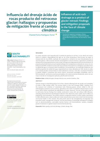 El cambio climático está intensificando la pérdida de glaciares en el Perú, lo que afecta de manera directa la calidad y disponibilidad del agua en las zonas altoandinas. Este proceso da origen al drenaje ácido de roca (DAR), resultado de la exposición y oxidación de rocas mineralizadas tras el retroceso glaciar. A ello se suman factores antropogénicos como la minería, la agricultura y la falta de infraestructura de saneamiento en zonas rurales, que agravan la degradación de los recursos hídricos. El presente policy brief sintetiza los principales hallazgos de investigaciones realizadas en zonas con y sin influencia del DAR, mediante la evaluación de parámetros fisicoquímicos y biológicos que determinan la calidad del agua y su impacto sobre la población y los ecosistemas. Los resultados evidencian una pérdida progresiva de calidad del agua, especialmente en áreas afectadas por DAR, donde la acidez y los metales pesados comprometen la salud ambiental y humana. Ante ello, se propone fortalecer la gestión integral y preventiva del recurso hídrico, priorizando estrategias sostenibles como la fitorremediación, las barreras reactivas permeables y los sistemas de biorremediación, junto con una mayor inversión en investigación aplicada y planificación territorial.