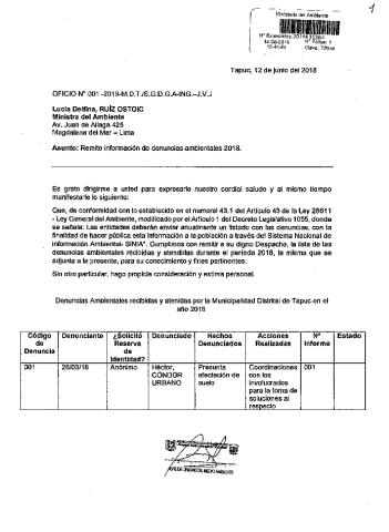 información de denuncias ambientales 2018 Municipalidad Distrital Tapuc